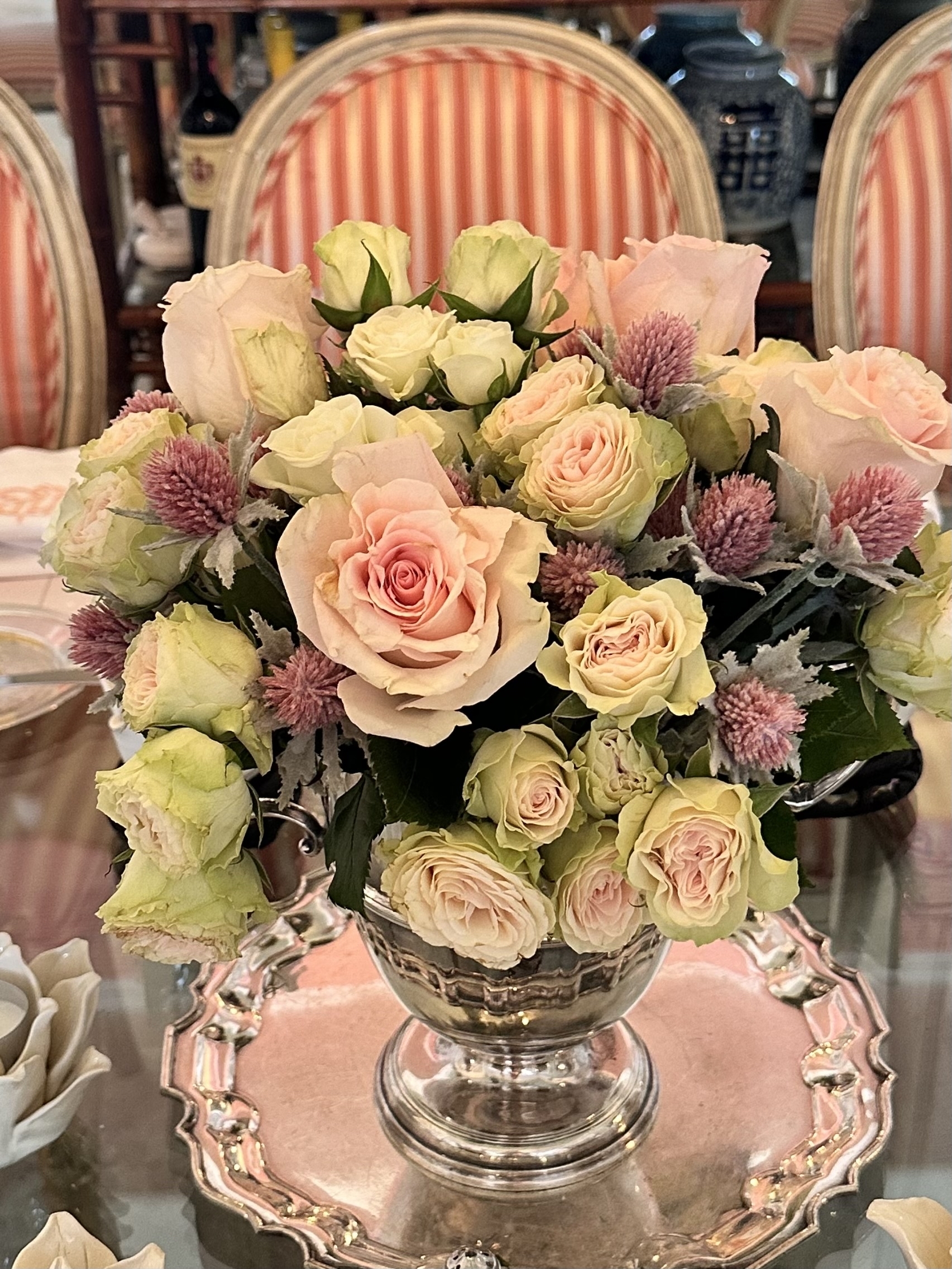 Place a silver tray underneath a floral arrangement to add a frame around the arrangement, add a touch of reflective sparkle, protect the table from spilled water, and serve to catch falling petals and staining stamens.